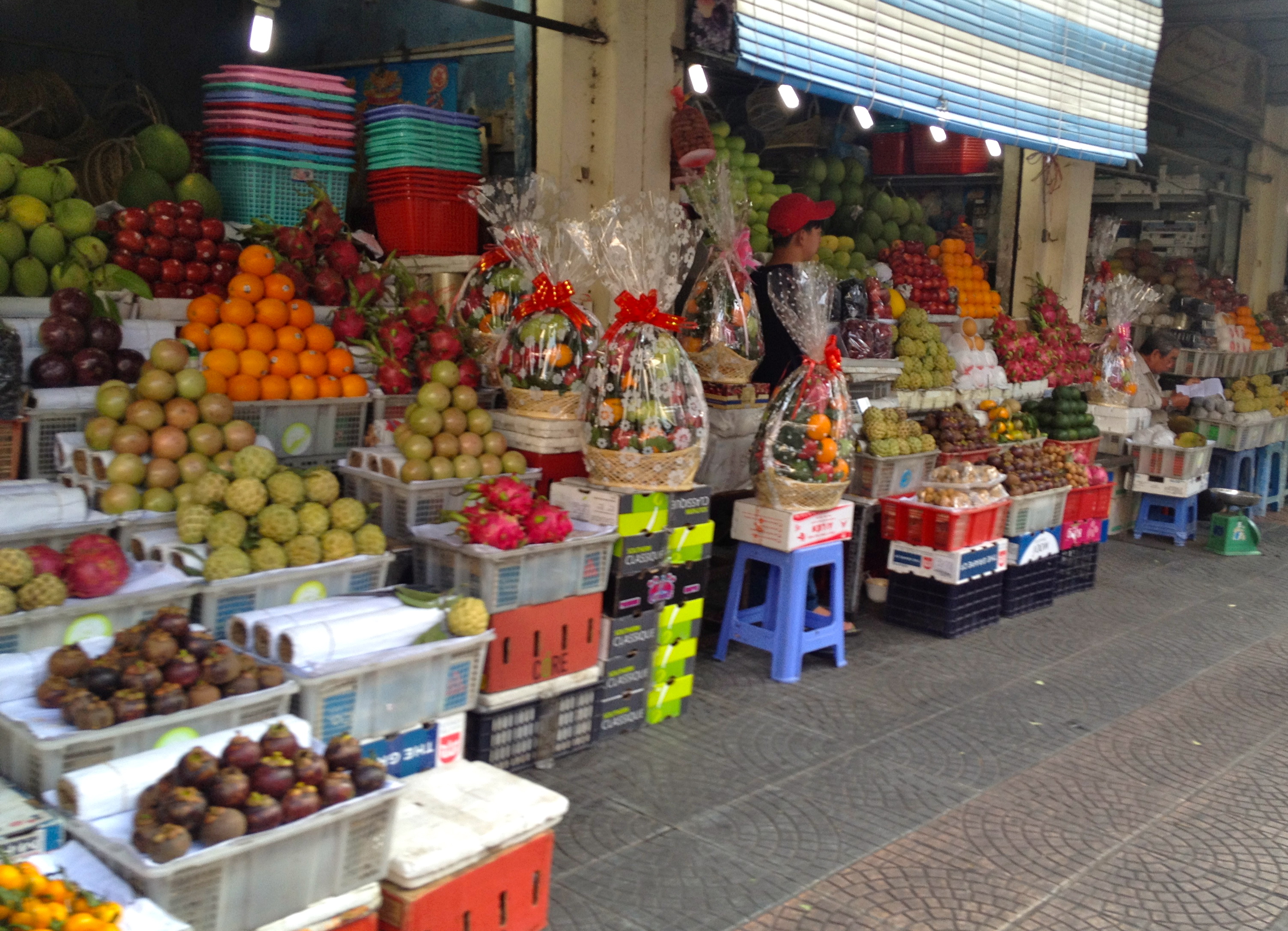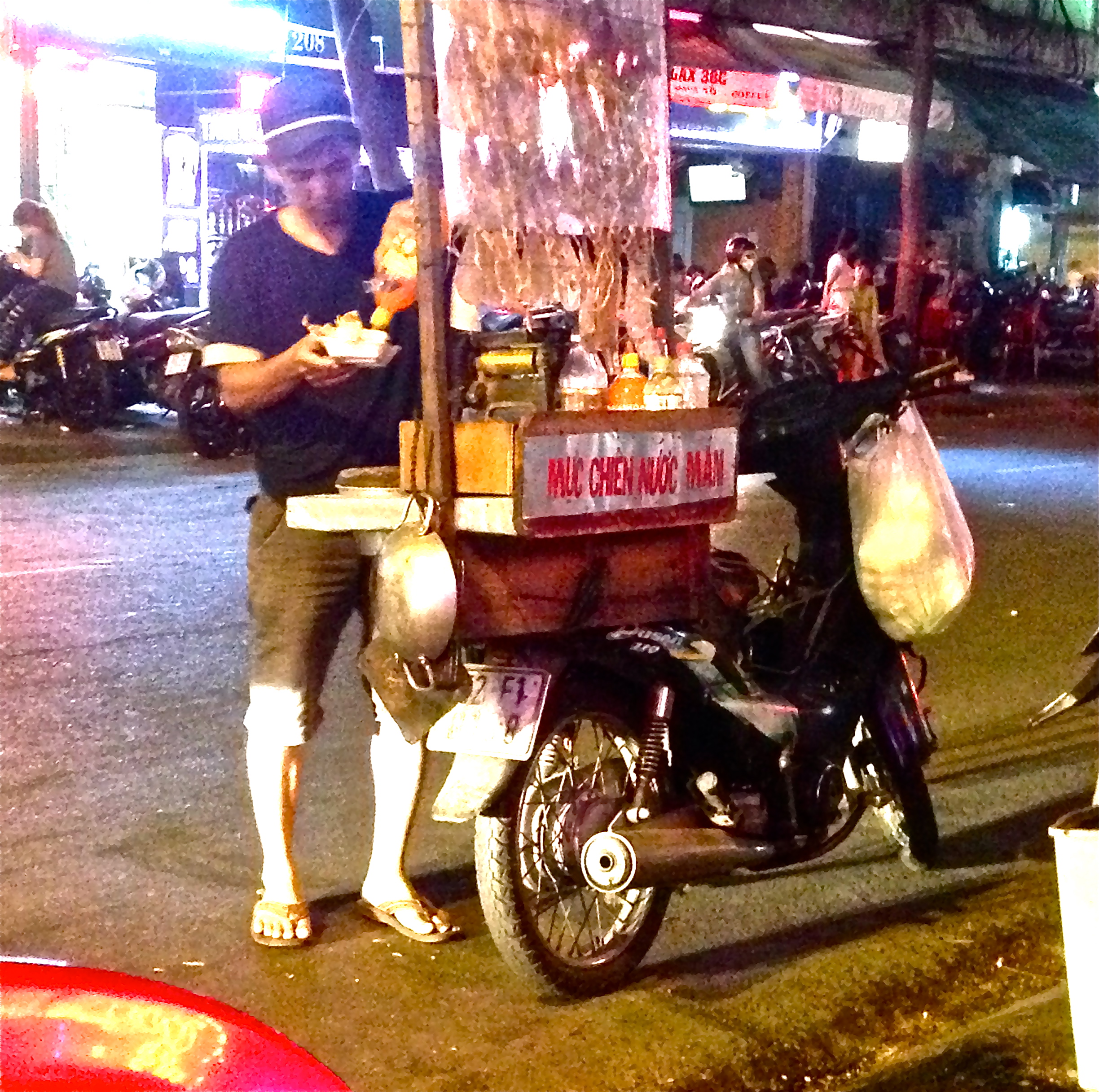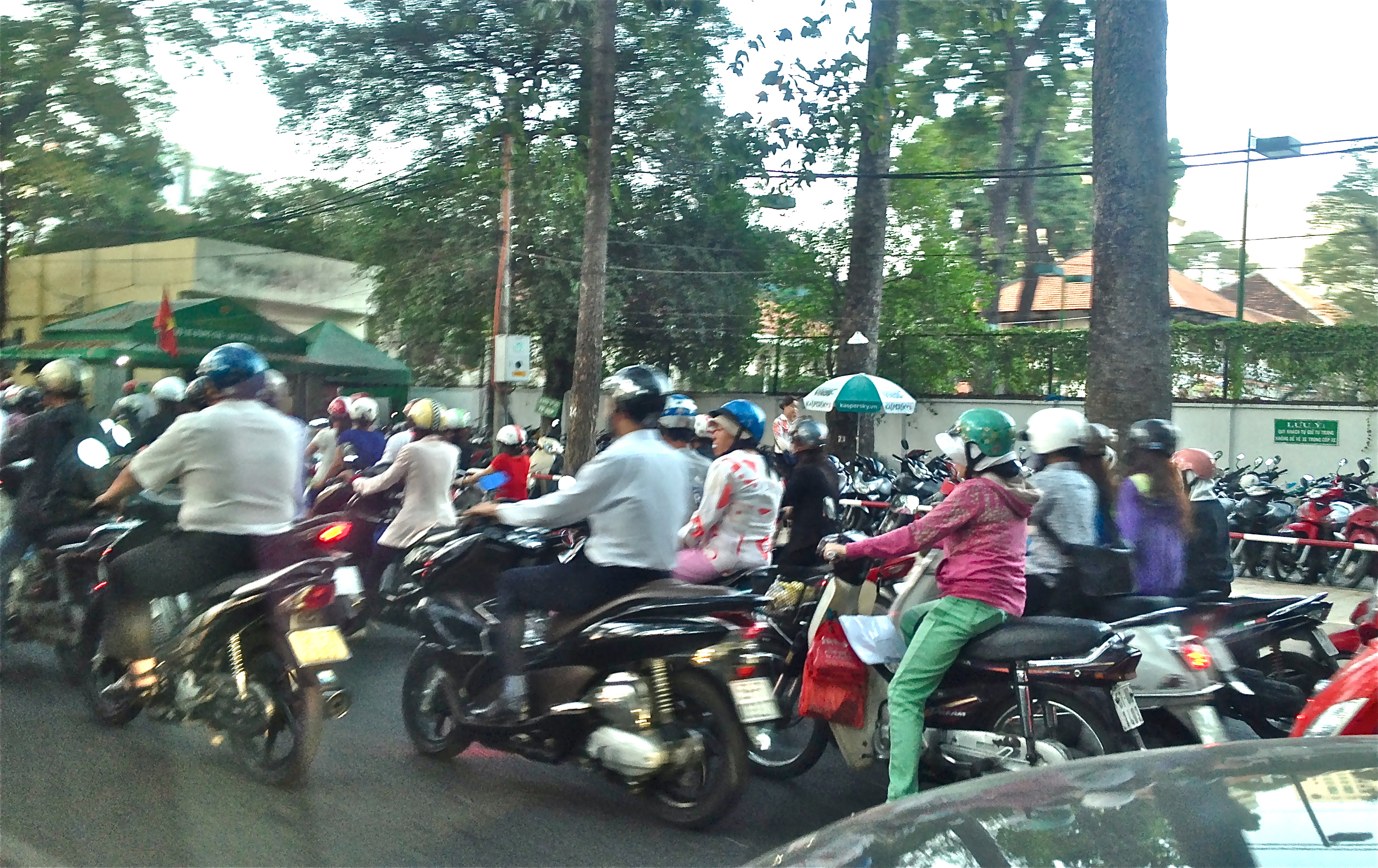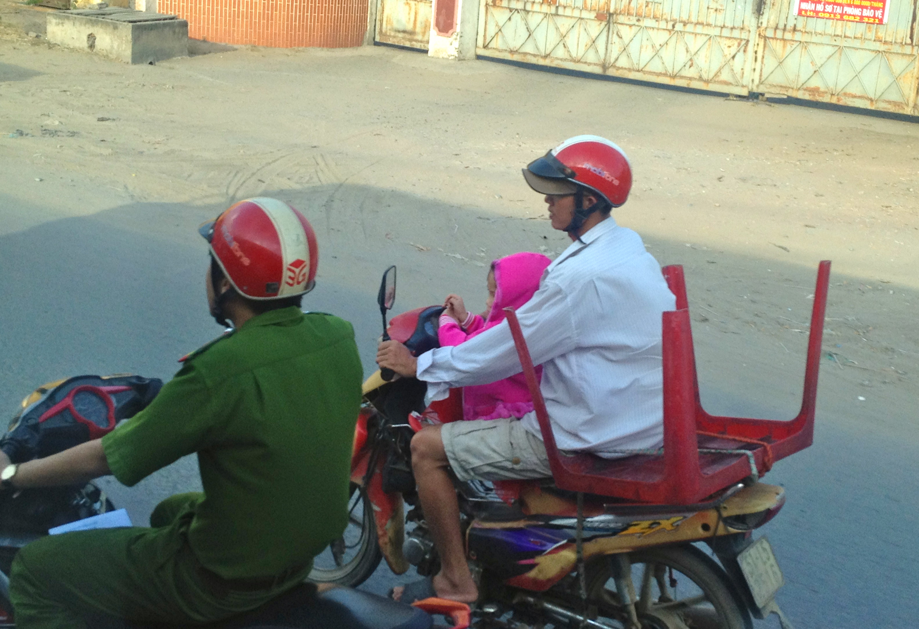 One of the first things we learned is that crossing the street should be an Olympic event. In the beginning, it’s a good idea to glue yourself to people who look like they know the ropes. The motorbikes outnumber the cars tenfold (at least) but most drivers are in complete control. The largest number of people a bike seems to acceptably hold is five– two adults and three kids. What can you transport on a motorbike? ANYTHING from 300 lbs of rice to multiple bags of garbage/recycling, to fruit, fish or even a 50” flat screen tv. Whatever you can hold onto. Makes for great people-watching that never gets old.
